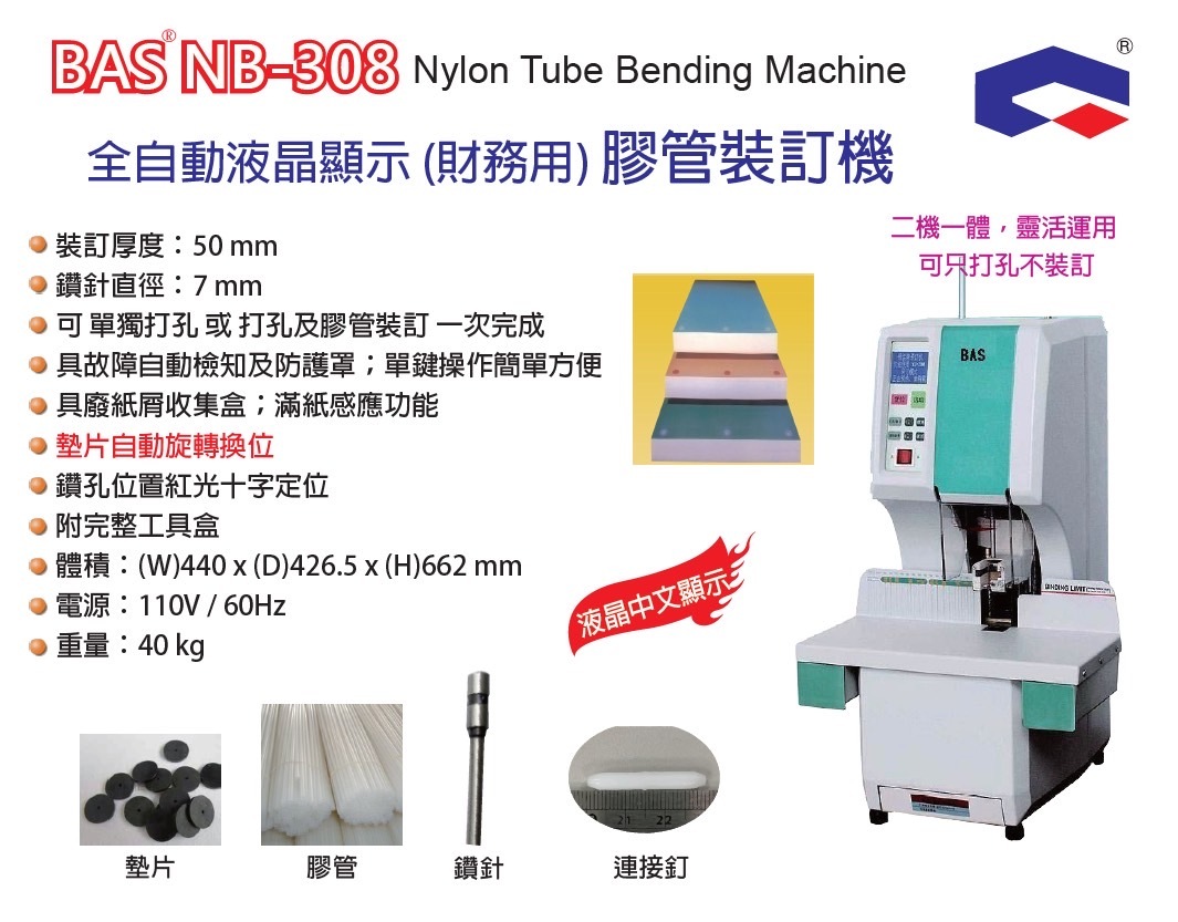 【辦公事務機】BAS NB-308 全自動膠管裝訂機(液晶中文顯示+墊片自動旋轉) 壓條機 打孔機 文具印刷 包裝紙器