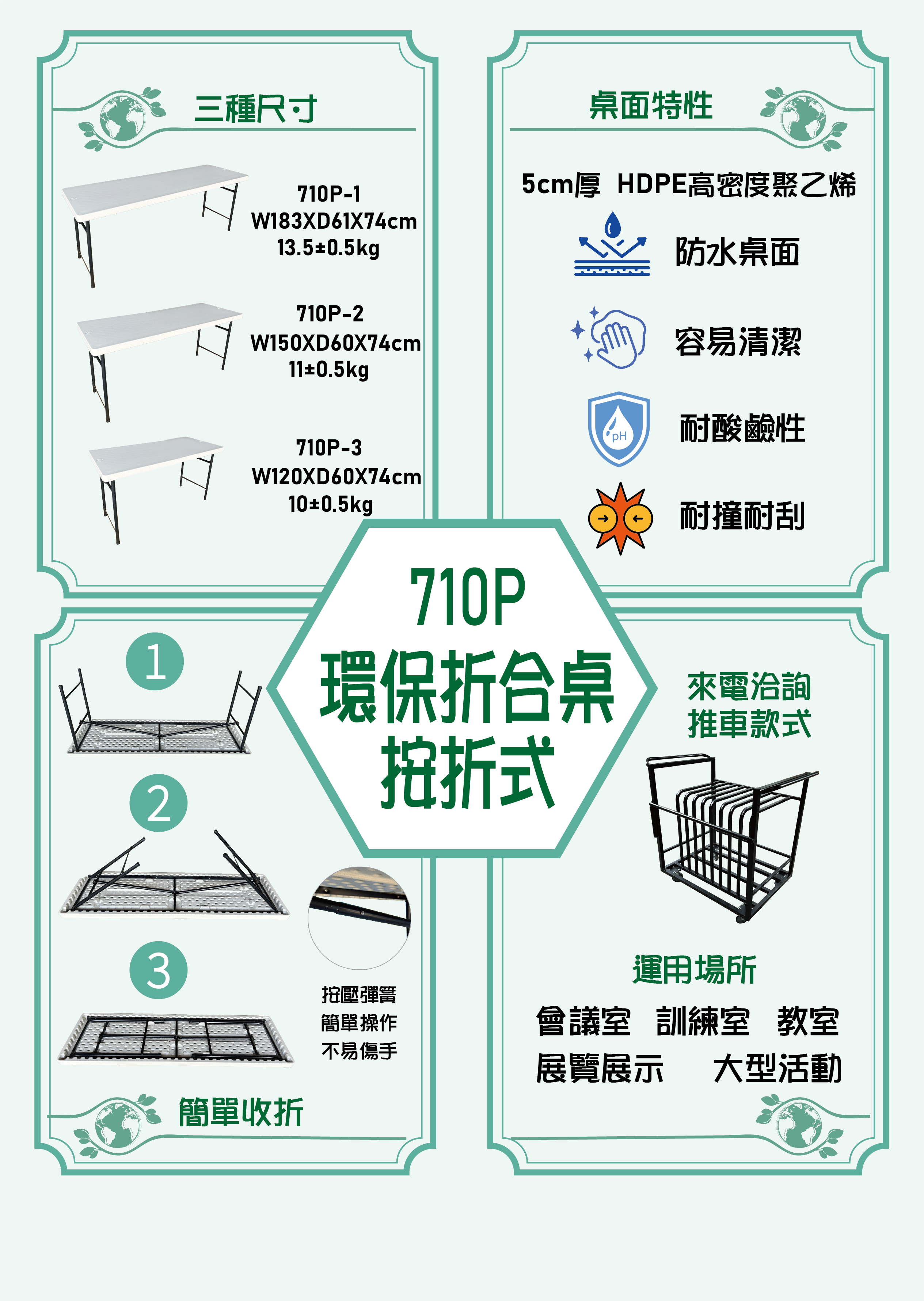 環保折合會議桌 710P-1 折合桌 摺疊桌 灰白桌板 耐衝擊 耐髒汙 耐酸鹼 耐刮 烤漆腳架 防滑腳墊 收折桌子 收納桌