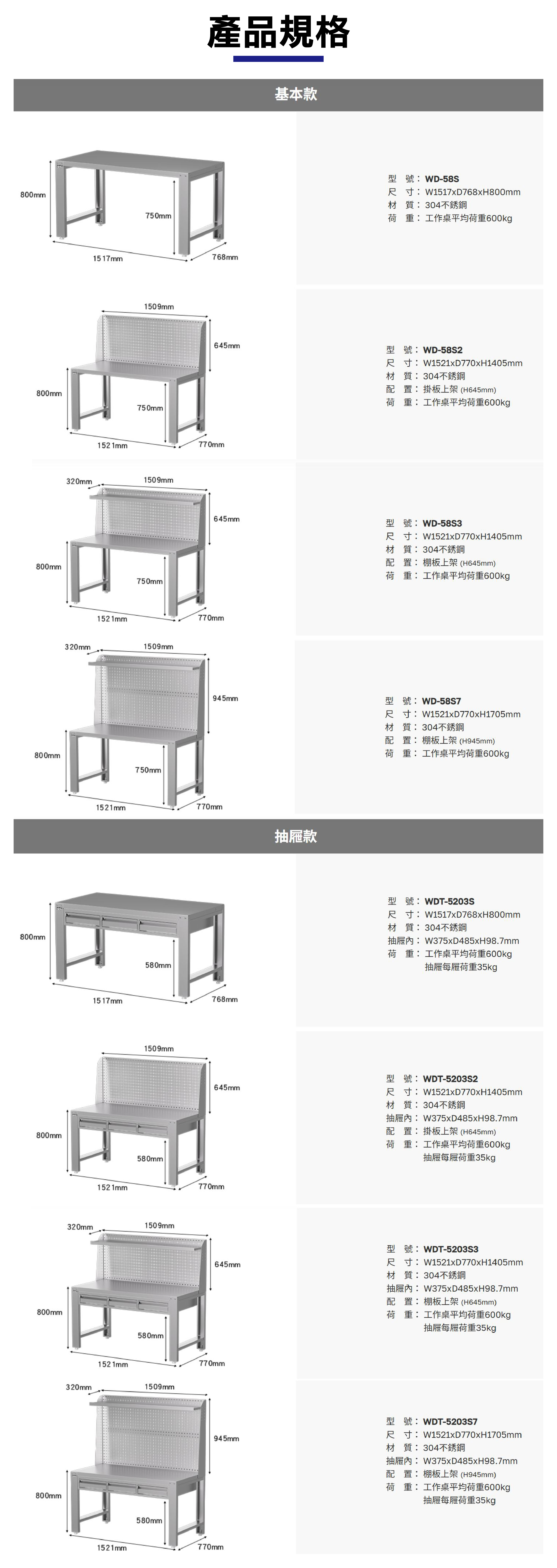 臺灣製造-天鋼 不銹鋼工作桌 WDT-5203S 抽屜款 寬1521mm 304不銹鋼桌面書桌 耐熱防水抗腐蝕 工業桌 工具桌 可加洞洞板 抽屜
