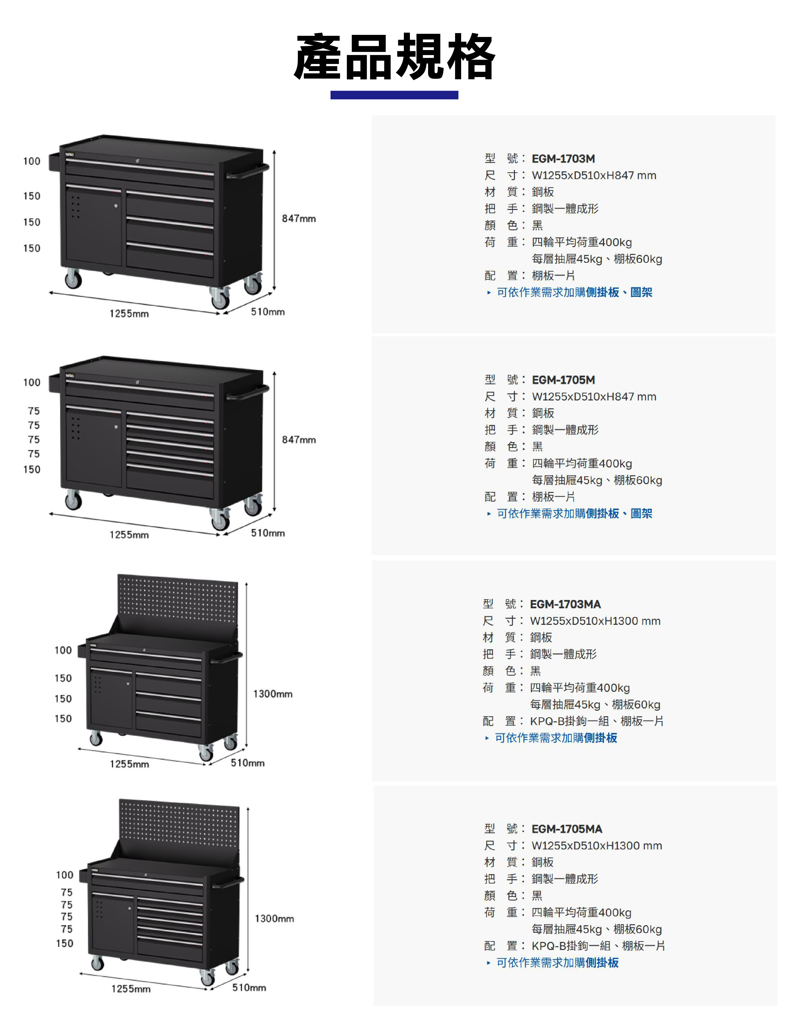 黑色工具車每層抽屜荷重45kg