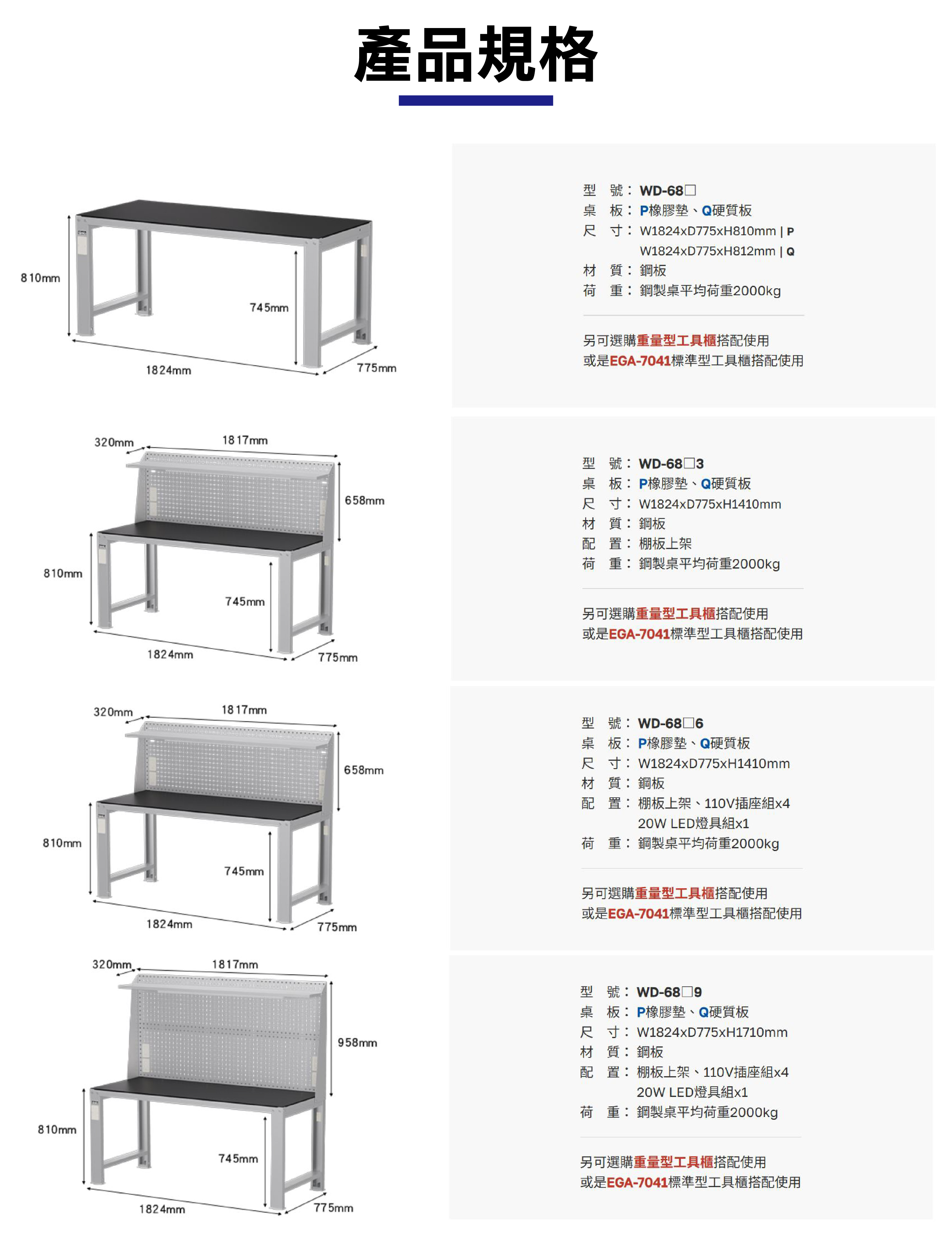 鋼製工作桌有(橡膠墊)及(硬質板)兩種桌墊選擇