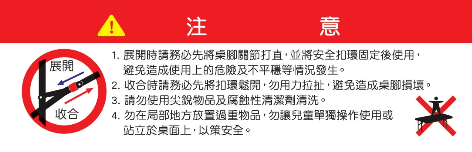 一體成型桌面,桌腳可摺疊,收放自如攜帶方便!加裝安全扣環防止桌面傾倒!