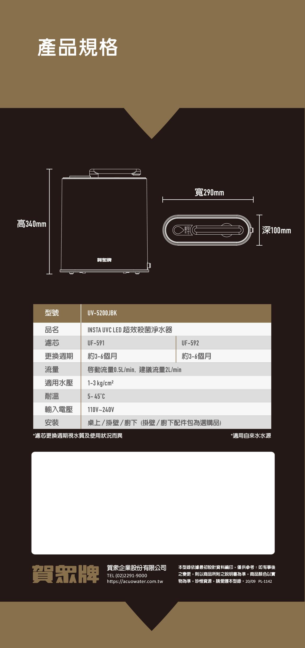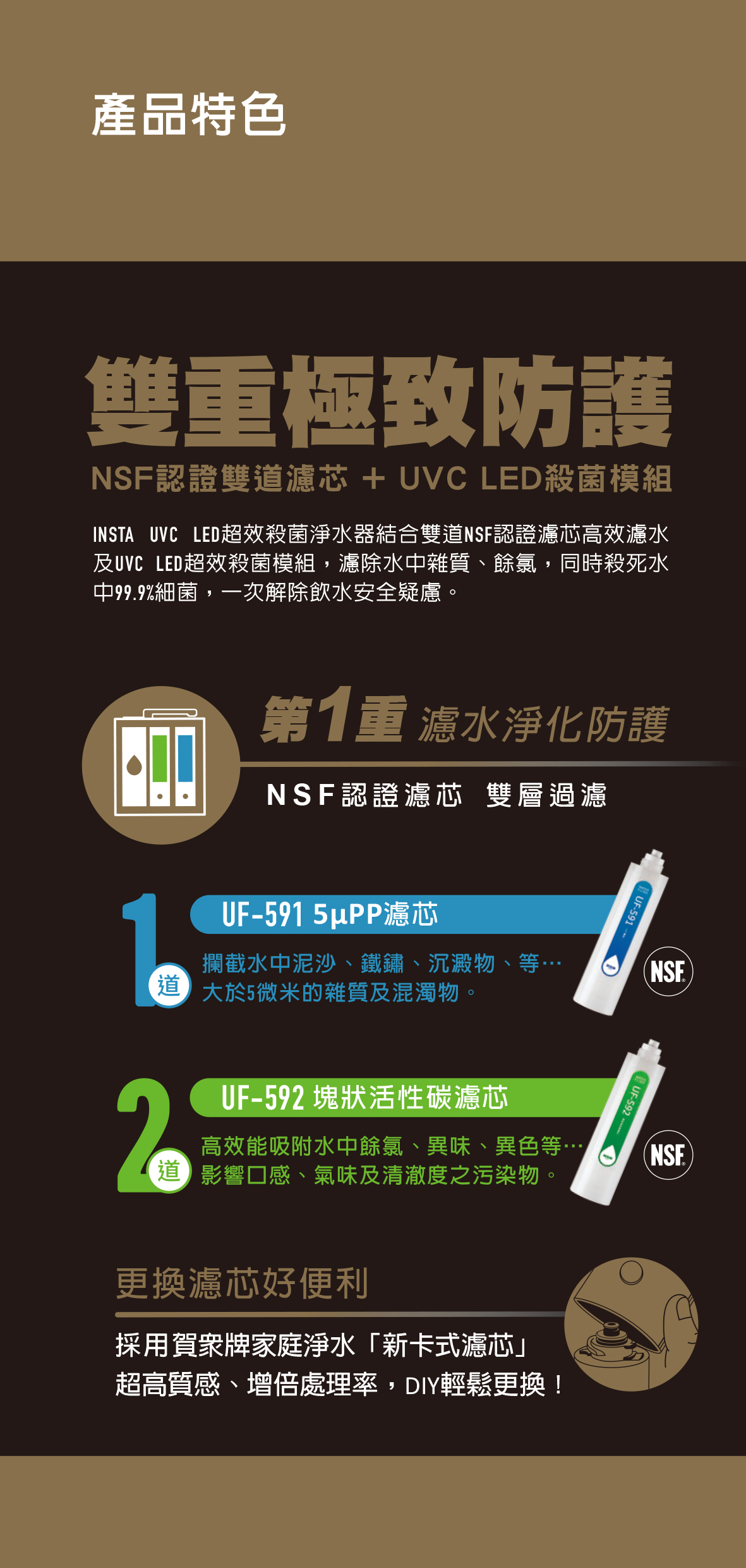■採用NSF認證雙道濾芯+UVC LED殺菌模組。